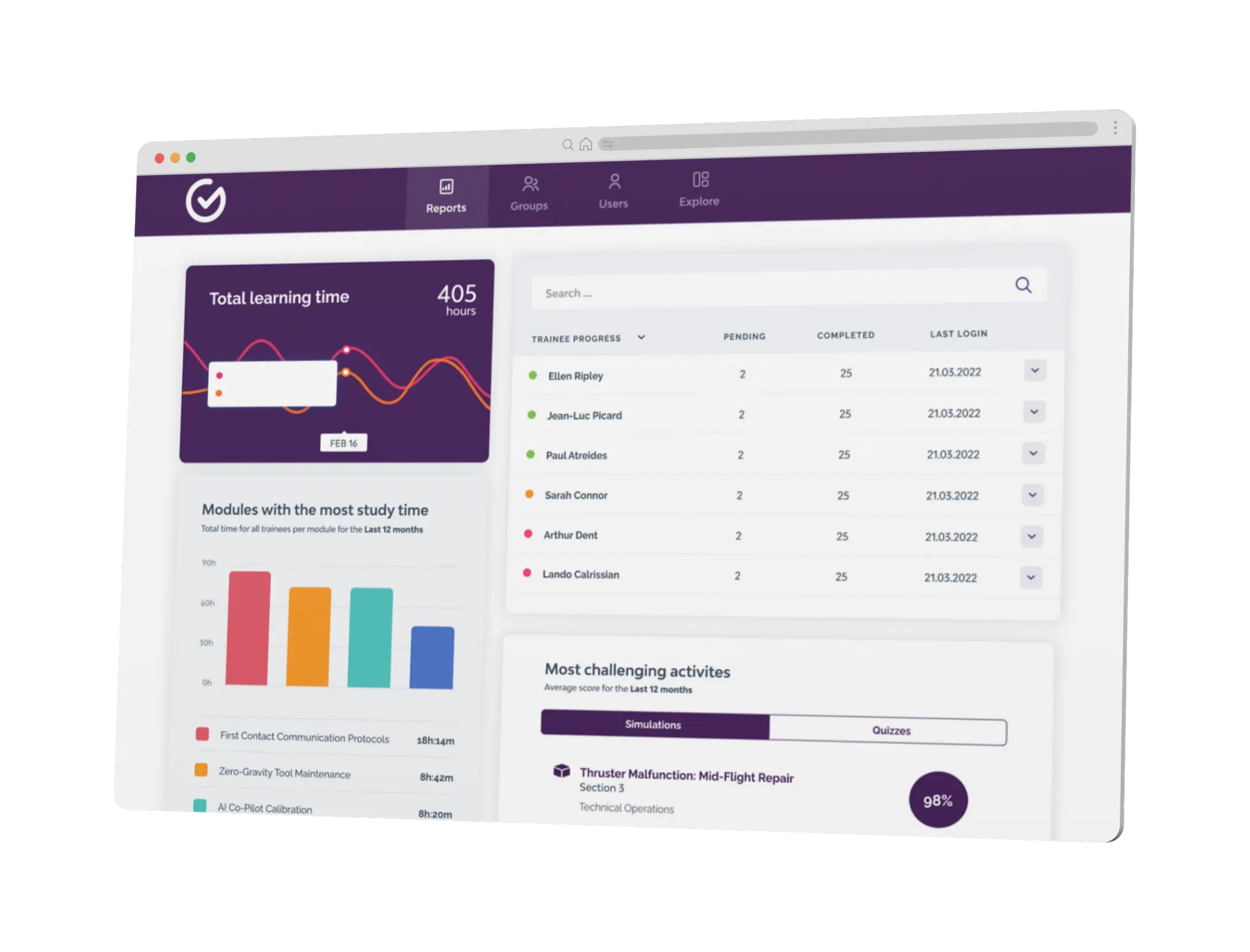 - LMS Integration: Assign modules, track completion, and analyze performance within your existing learning system