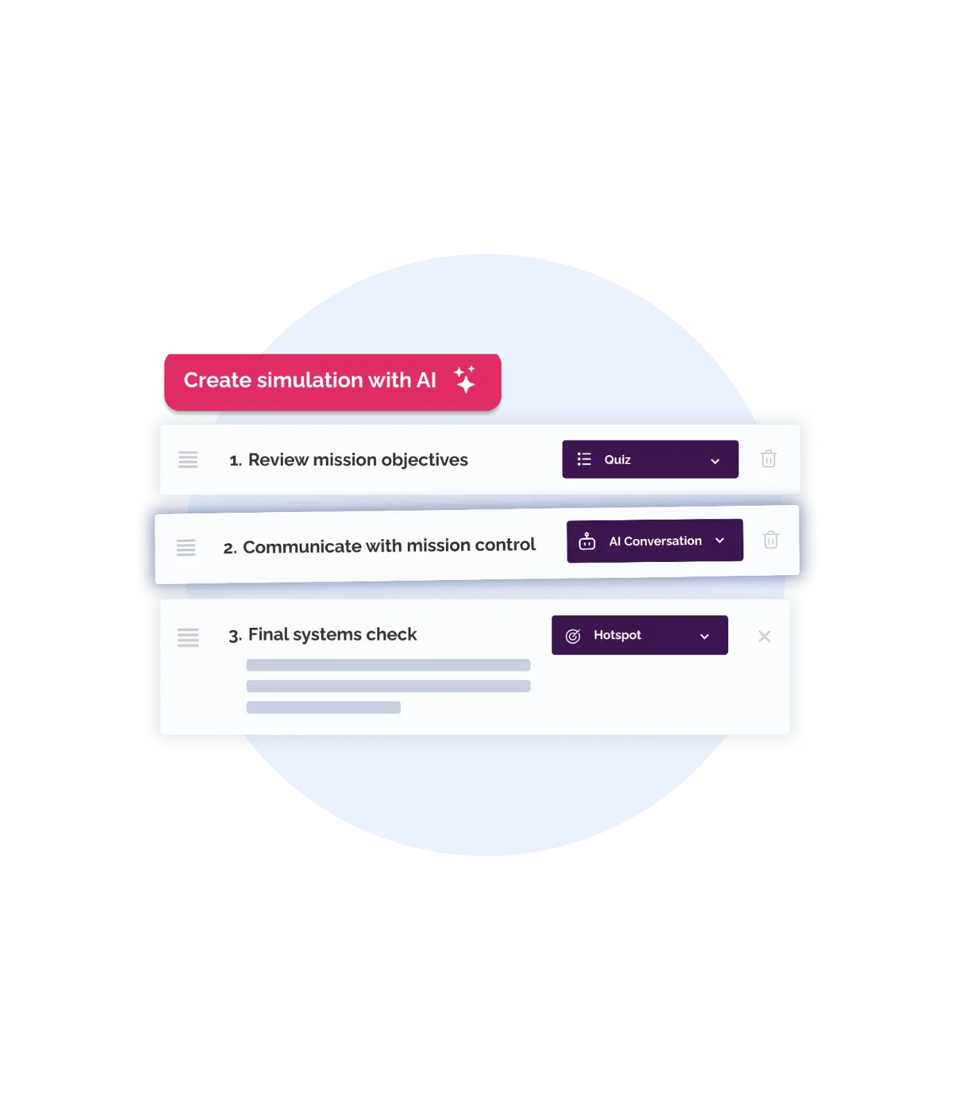 Example: Enter a short description like “train a lab tech on proper PPE selection” and let the AI propose a full simulation structure.